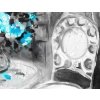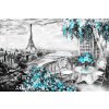 Obraz, který nejvíce doladí vintage styl, krásná Eiffelova věž v černobílém provedení s modrými kvítky bude příjemnou dekorací.