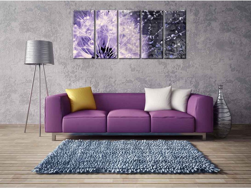 Luxusní vícedílný obraz do obývacího pokoje nebo ložnice je ve fialovém ladění krásnou dekorací. Oblíbený motiv odkvetlé pampelišky s rosou je stále žádaný.
